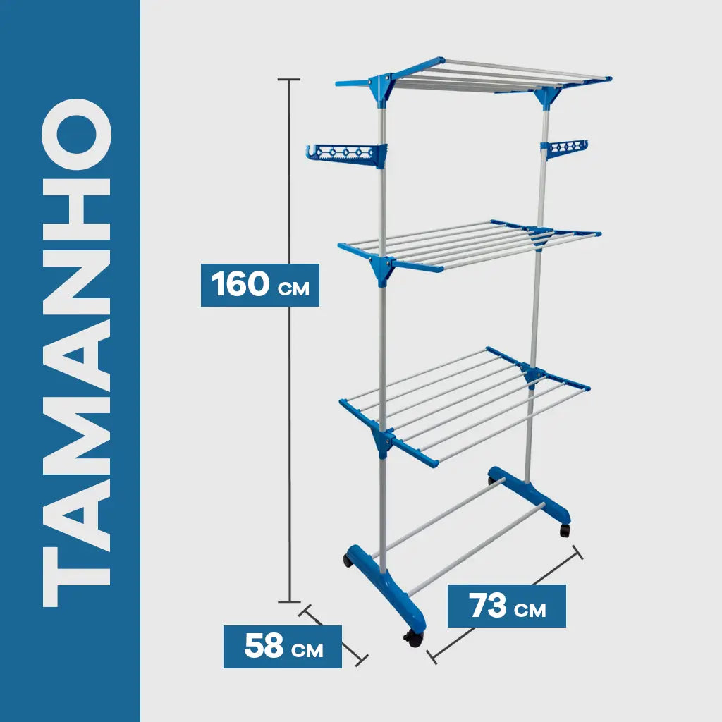 O Tower Varal 3 Andares possui 2 abas laterais, onde você pode pendurar mais de 10 cabides, e uma barra de apoio para sapatos. Ele conta com 3 prateleiras, e cada uma suporta até 10 kg, garantindo espaço e resistência para secar suas roupas com tranquilidade.