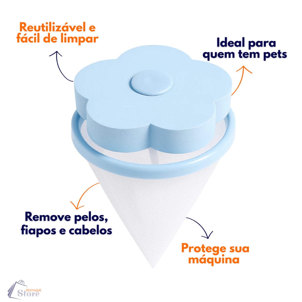 Filtro Flutuante: Basta colocar dentro da máquina e ele coleta pelos e fiapos enquanto boia durante a lavagem.