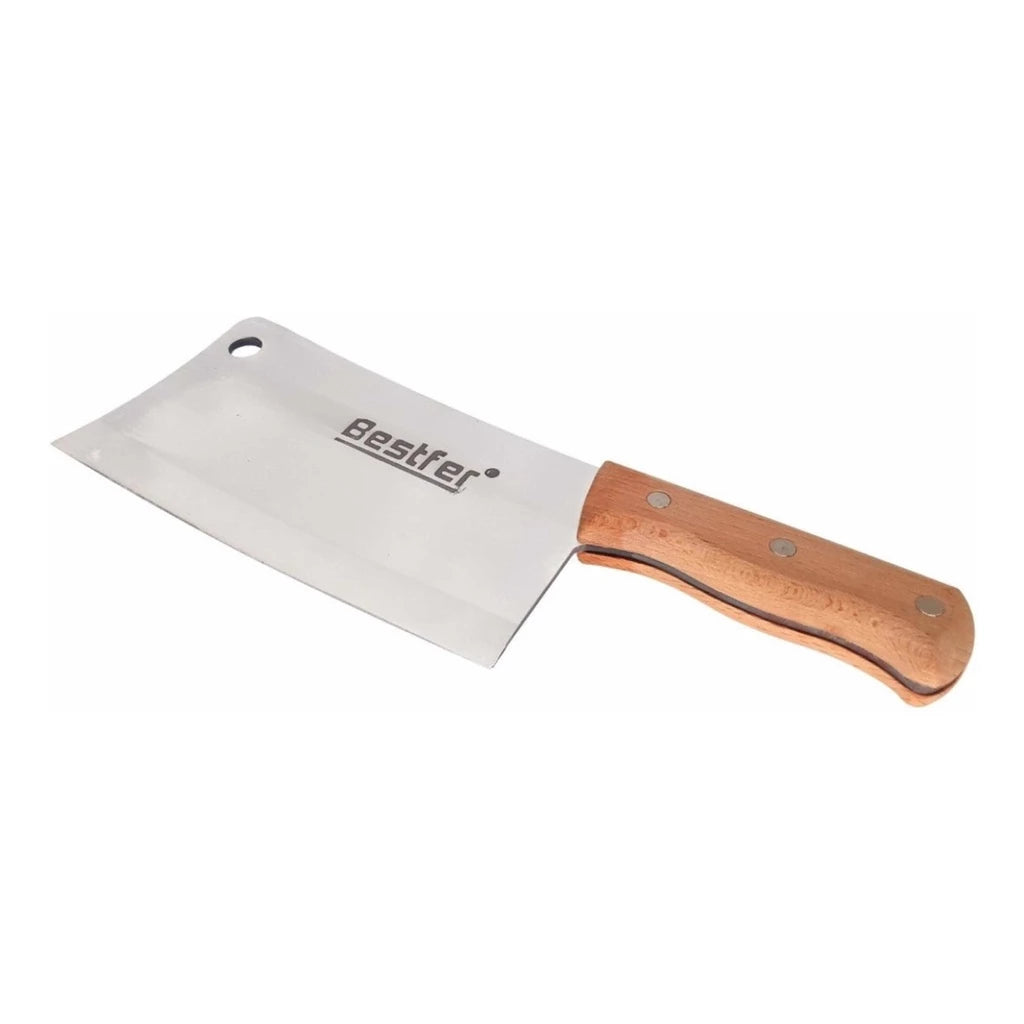 Cabo de madeira aderente fixado com pinos de aço inoxidável. Fácil higienização e formato adequado para dar firmeza ao segurá-lo.