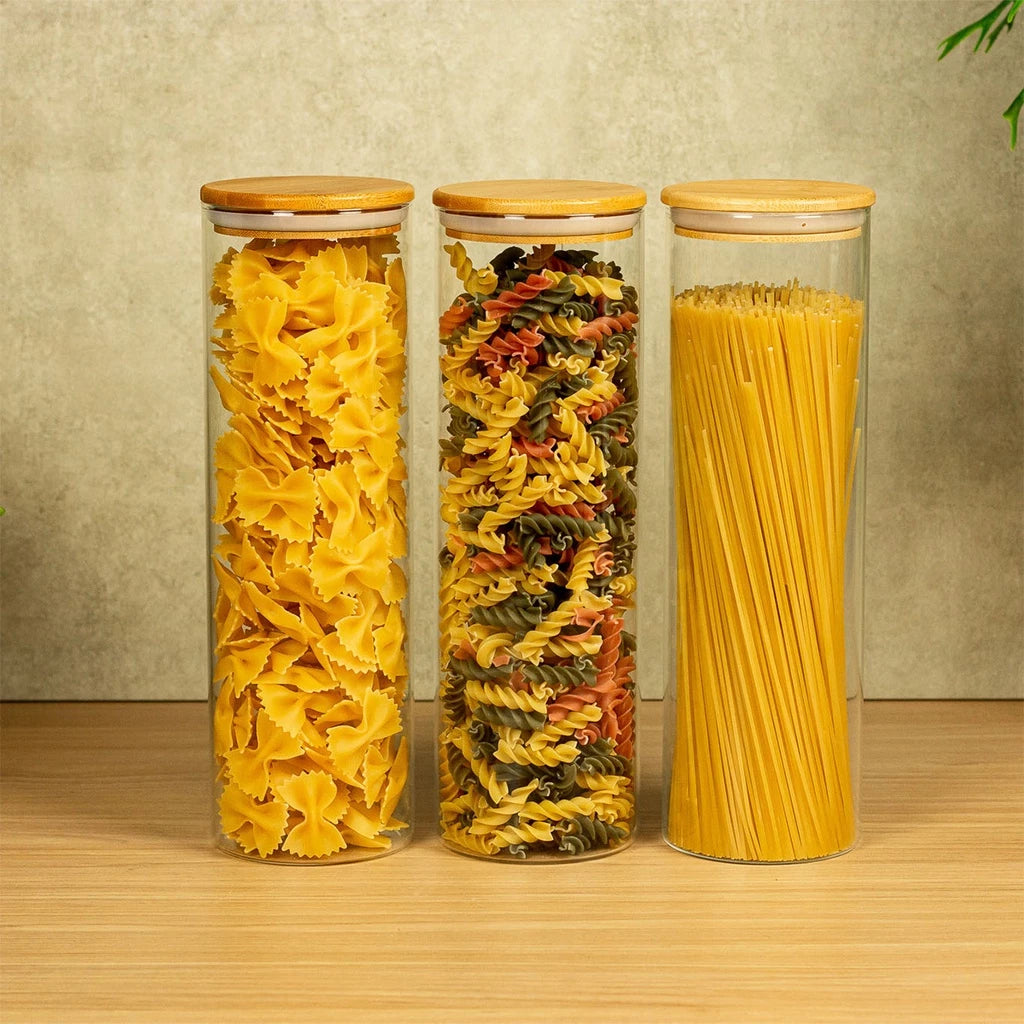 3 potes de vidro herméticos para mantimentos com tampa de bambu redonda