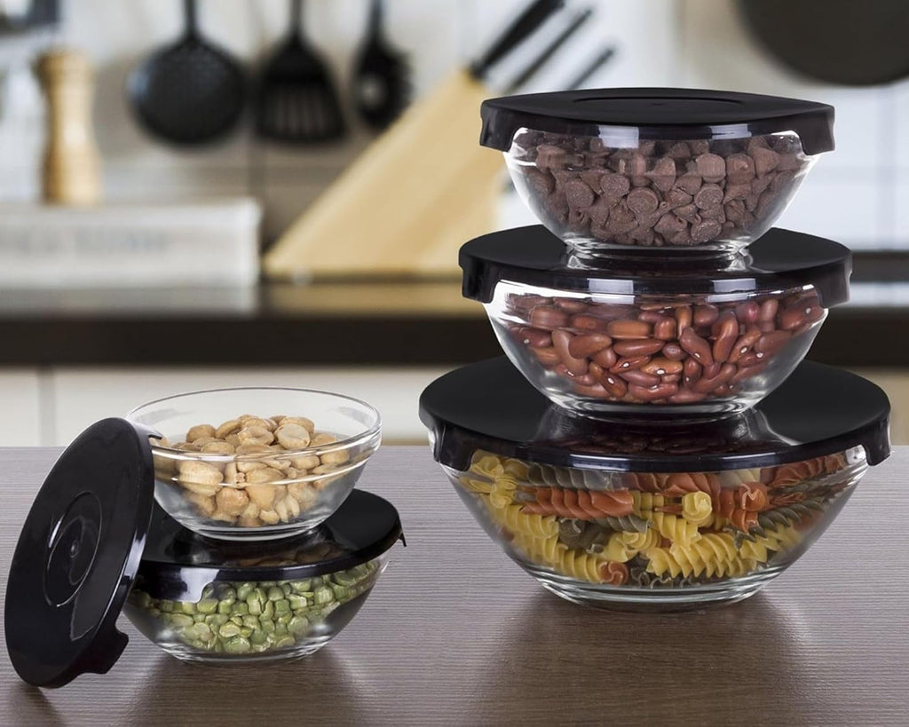 Renove sua cozinha com o Conjunto de Tigelas Bowls de Vidro com tampa na elegante cor preta. Este conjunto é composto por uma variedade de tamanhos, atendendo às suas diferentes necessidades de armazenamento e preparação de alimentos.